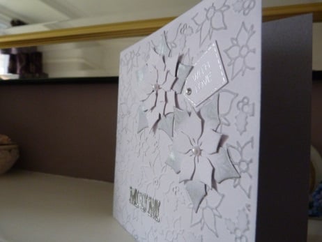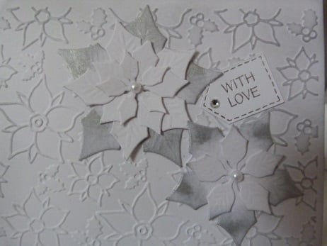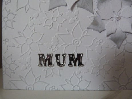 A pristine white, quality card which has had a pretty festive pattern embossed. Covered with two poinsettias which have been die cut and silvered. The centre finished off with a pearl. A with love tag decorated with a silver rhinestone. The edges of the card have been silvered to emphasise the pretty embossed design. Finished off with wording of choice, in this instance MUM.