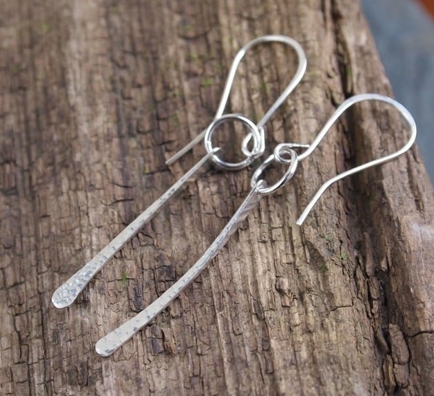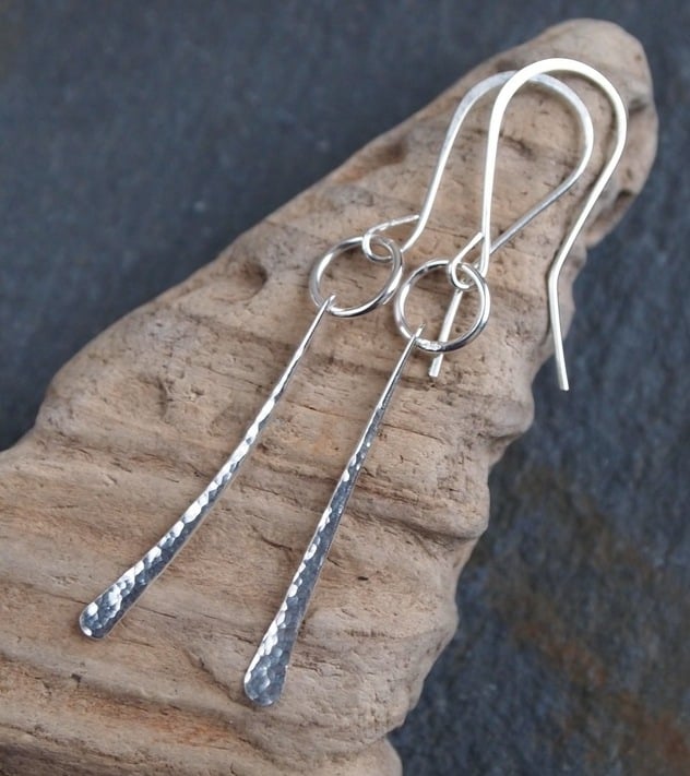 Argentium silver 940 earrings, long dangle ring and rod earrings
