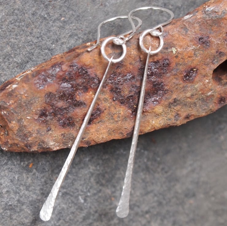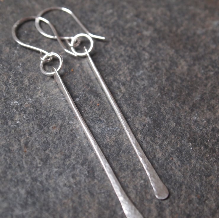 Hand forged & hammered Argentium silver dangly earrings. These earrings are long and elegant and the texture allows them to catch the light beautifully and sparkle as they move around.