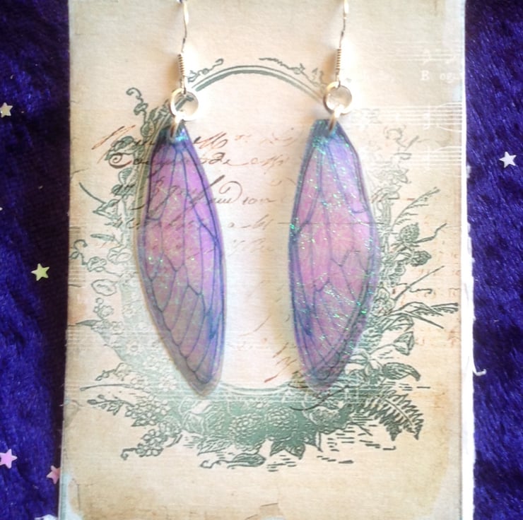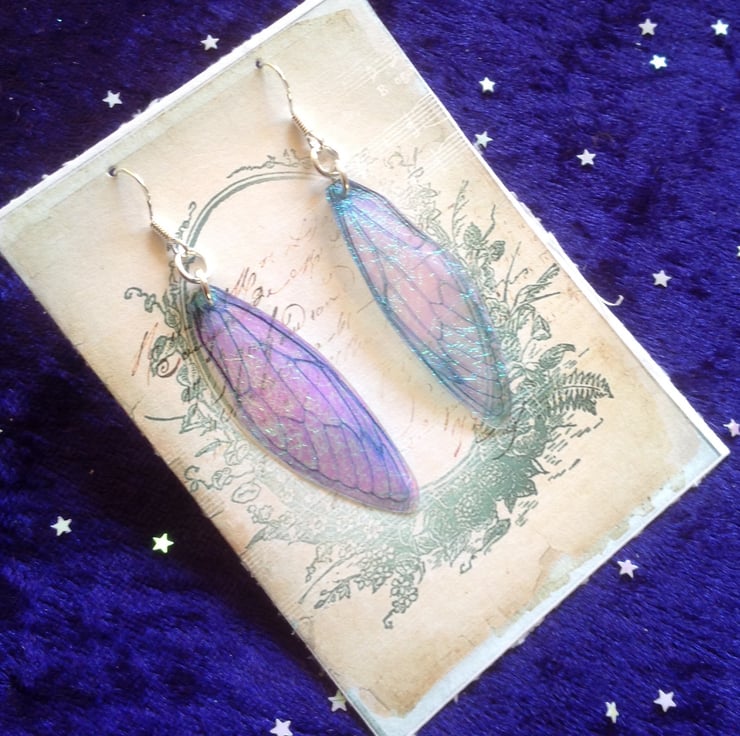 Blue Iridescent fairy wing earrings made from layers of acetate.