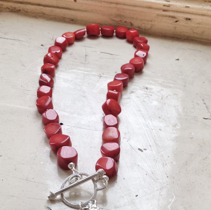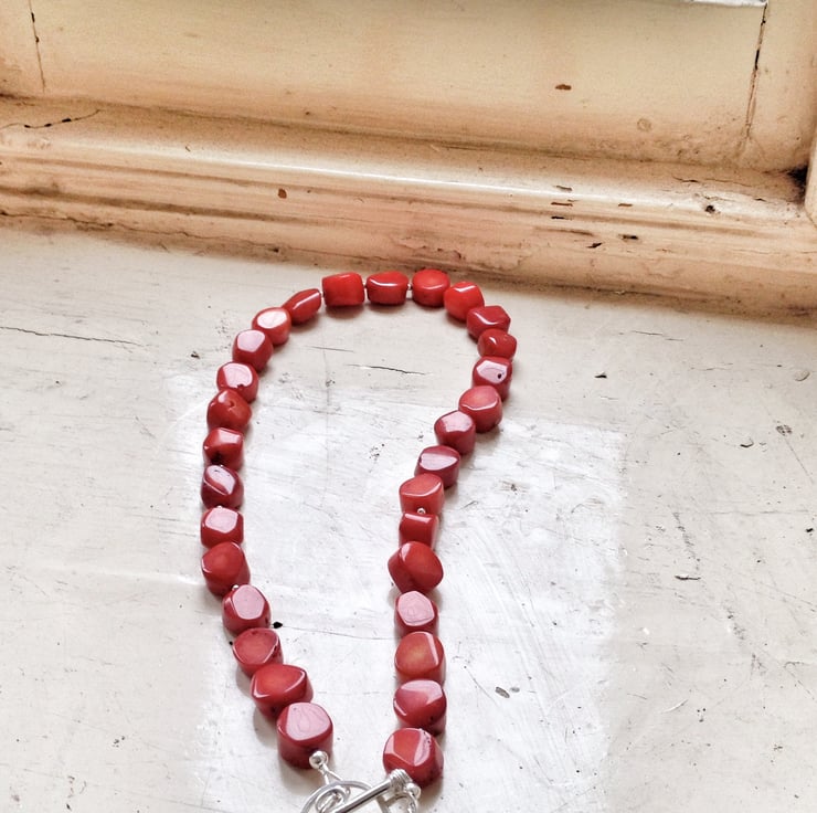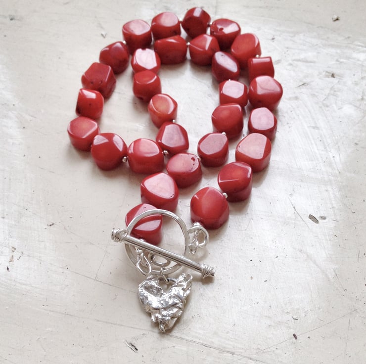 This necklace is made of 11-12mm coral beads and has a handmade sterling silver toggle clasp, which is its focal point. A hand cast solid silver heart is attached to the clasp, giving it a lovely artisan touch.