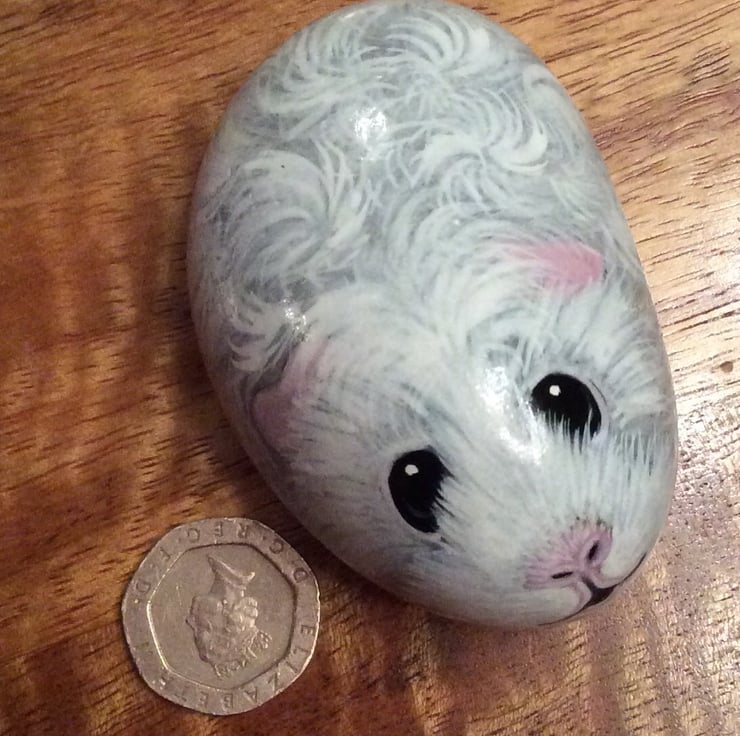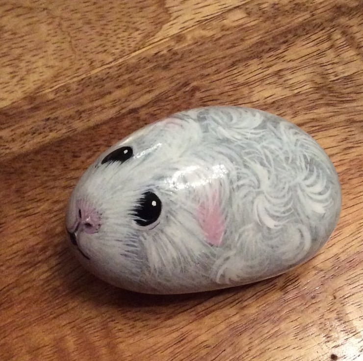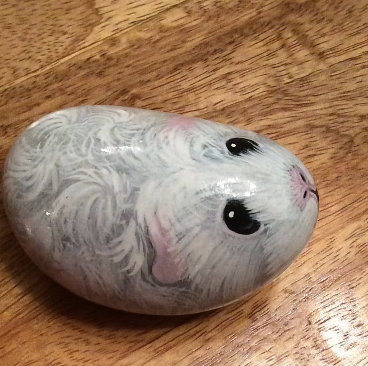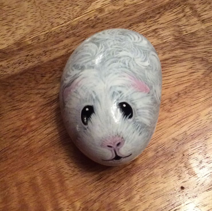This little white guinea pig has been hand painted on a smooth stone and glazed for a glossy finish.