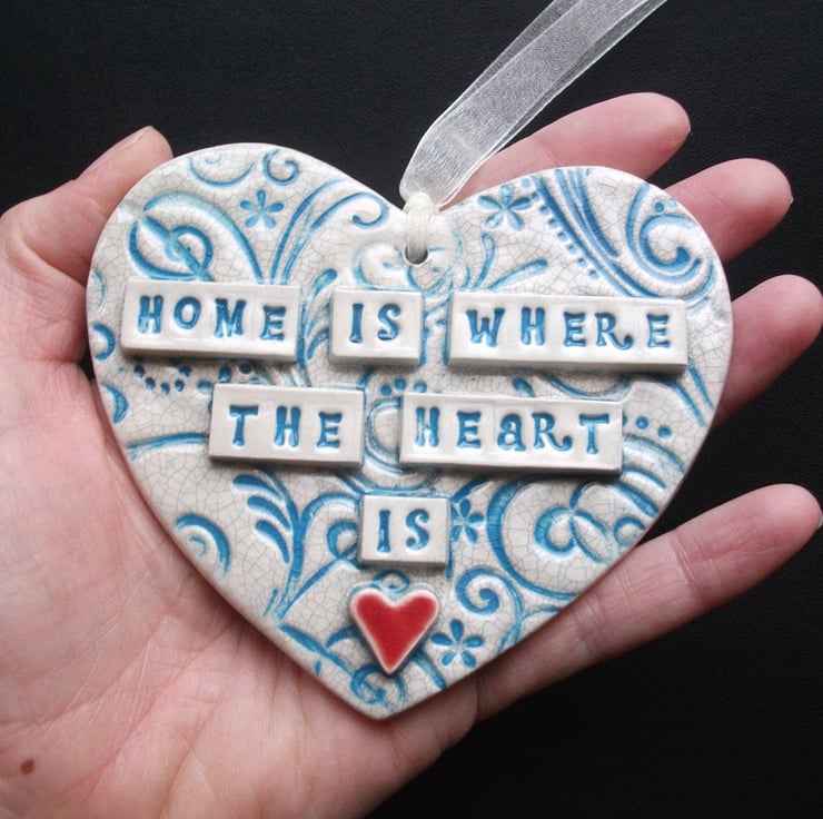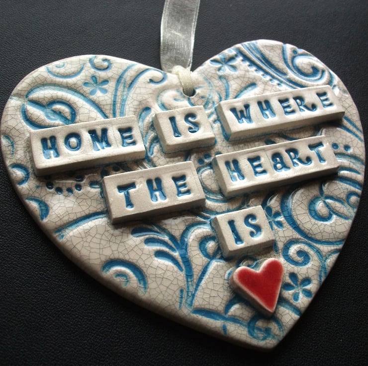 This ceramic heart is made from white earthenware clay and decorated with the words, Home is where the Heart is.