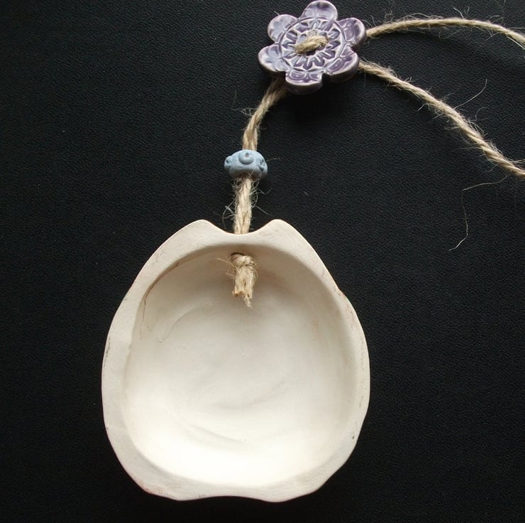 It has been decorated with bright, glossy glazes and finished with a rustic twine. It has a matching bead and a bright ceramic flower button.