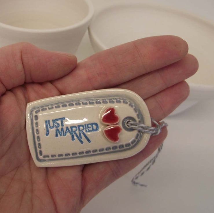 This little tag decoration is made from white earthenware clay and imprinted with the words Just Married.