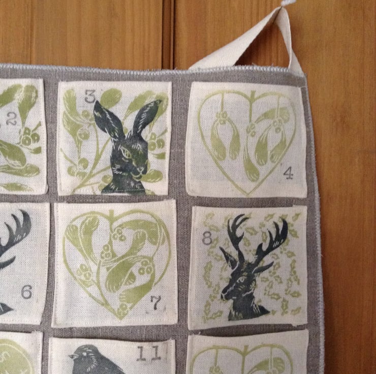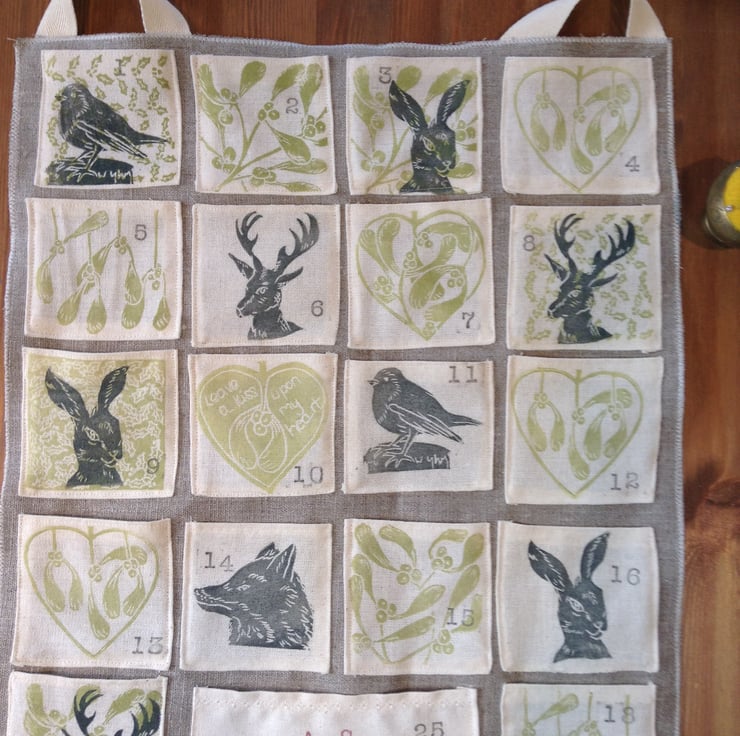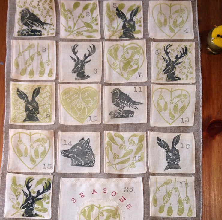 Each pocket has been hand printed with either a mistletoe, or holly design or woodland creature or both!