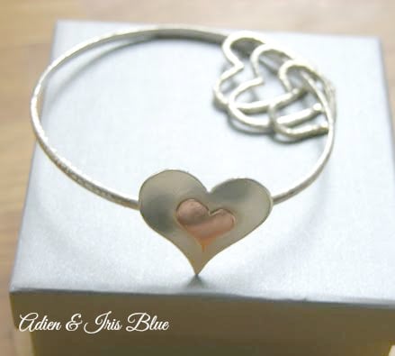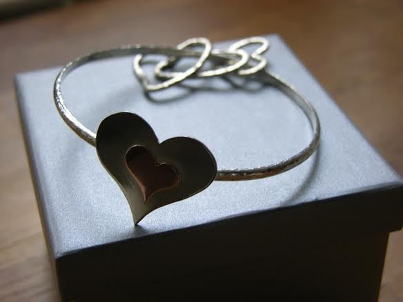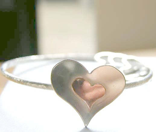 Wear your heart on your sleeve... a bespoke bangle with a large heart 3cm with a smaller copper heart overlaid, this can be a symbol for your partner and I can add any number of hammered hearts which move along the bangle to reflect your loved ones- children, grandchildren or any loved one.