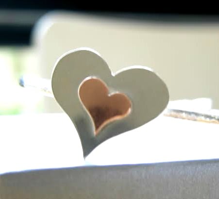 The centre is a beautiful wide sterling silver heart with a second copper heart . The piece is hand cut, sanded and polished to a contemporary finish.