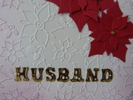 A lovely design of poinsettias and holly embossed onto quality cream card. Two poinsettias die cut from red card, the centres finished off with gold rhinestones. Husband die cut from gold mirri card. Completed with a With Love tag. The edges of the card have been coloured with red stamp.