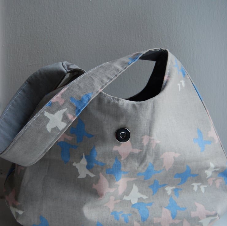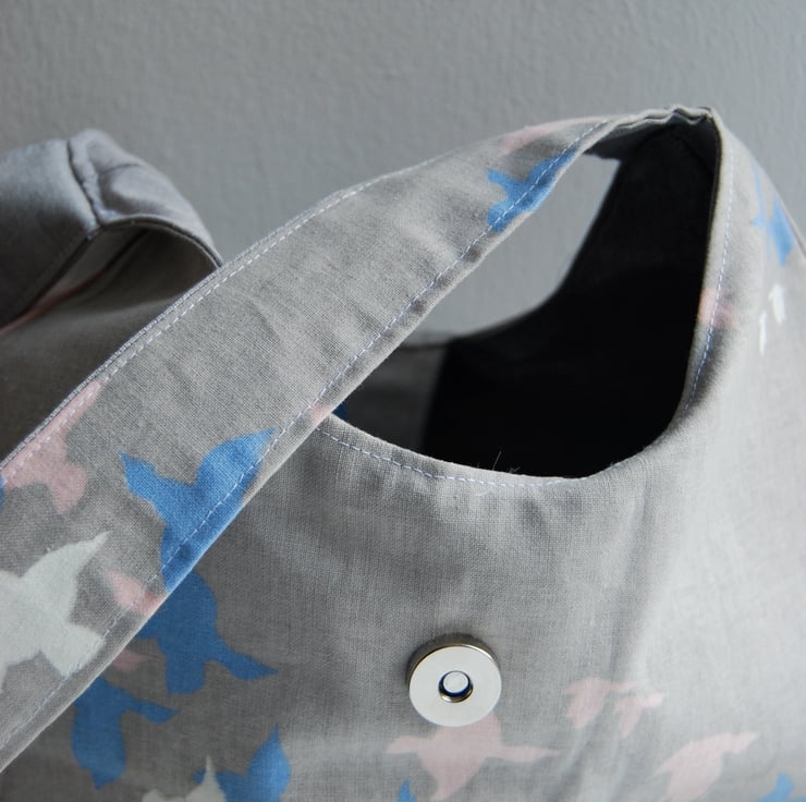 A fully lined, handmade, smart medium bag. Made from 100% cotton outer and lining which has been interfaced for extra stability. The bag has a handy internal pocket for keys, phone or change. Approx 30cm wide, bag body approx 20cm high. The single strap can be worn from the shoulder or can be held in your hand. Features a fold over closure containing a magnetic snap for extra security.