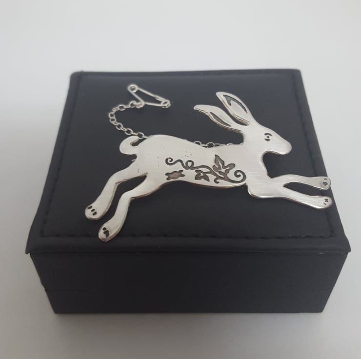 The gorgeous silver hare is hand cut from sheet silver, measuring 55x35mm and is decorated with surface detail and an ivy vine design which is etched into the silver to give a permanent pattern and makes it a fascinating and unique piece of jewellery.