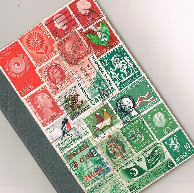 As well as a single Cuban stamp, the OOAK cover collage of this notebook also includes postage stamps from: Argentina, Australia, Canada, Costa Rica, Egypt, Finland, Germany, Hungary, Ireland, the Netherlands, New Zealand, Norway, Rhodesia & Nyasaland, Sweden, and Switzerland.