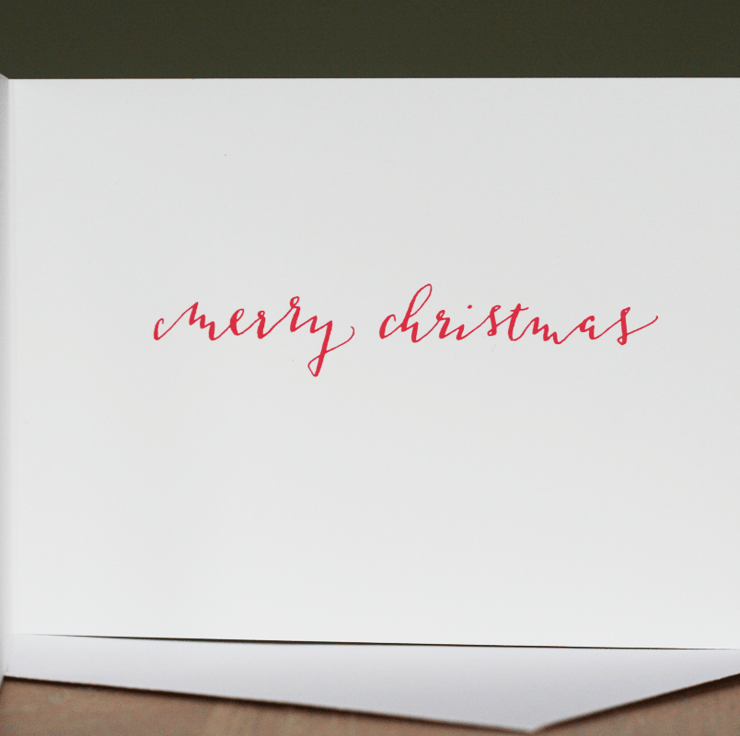 The hens were painted in watercolour, with details added in ink. Inside, the words 'merry christmas' were written in a contemporary calligraphy style using a traditional dip pen. The background is a soft white.