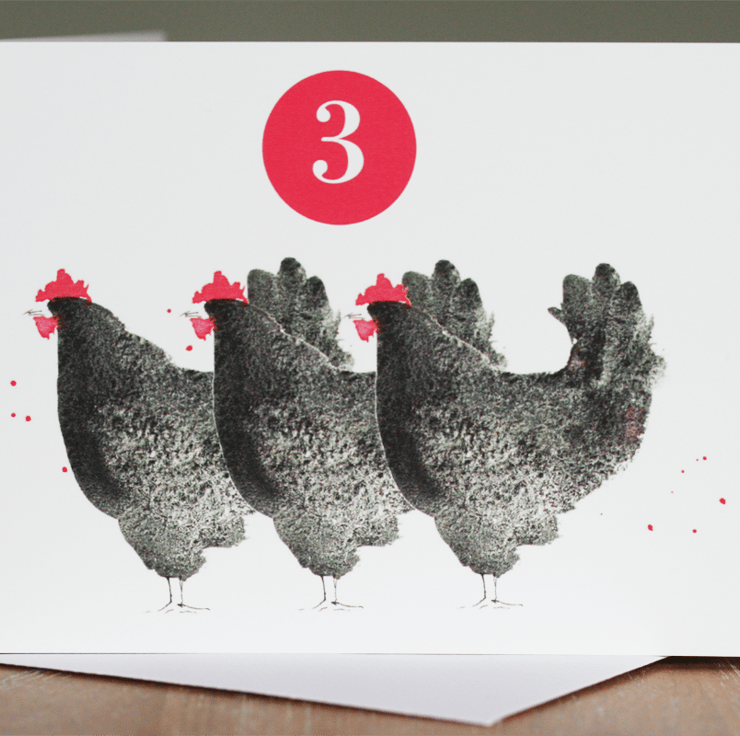 The traditional Christmas song, The Twelve Days of Christmas was the inspiration for the design. The combination of the unpredictable quality of watercolour and the texture of the thick watercolour paper resulted in the speckled effect of the hens' feathers.