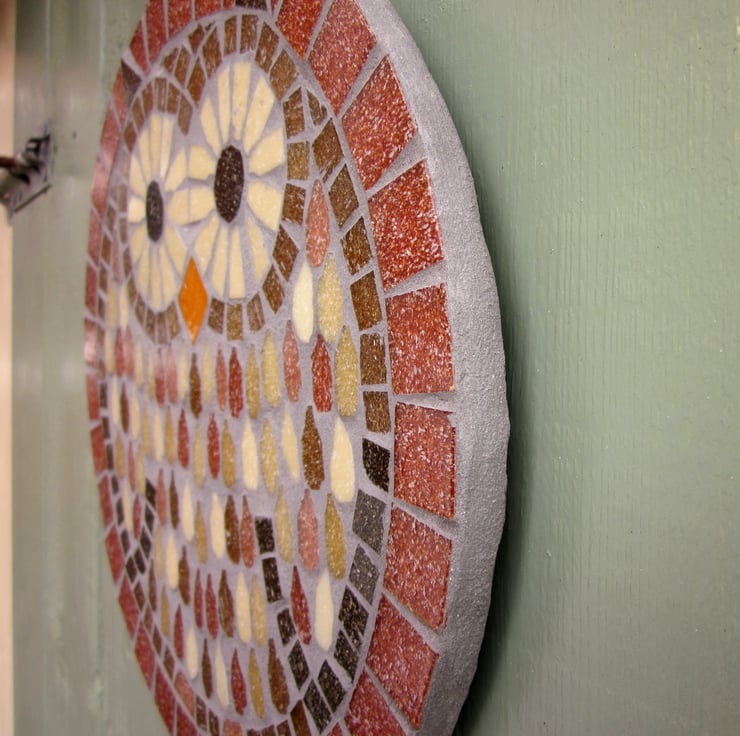 A 25cm diameter slate base with a mosaic made out of vitreous glass tiles. The mosaic is finished with a cement grey grout that is designed to repel algae and mold. Comes with a securely attached d-ring to hang with.