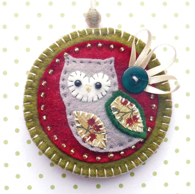 It features a little felt owl with applique wing and belly in pretty cotton print fabric. It is mounted onto a dark red felt base which is edged with gold coloured seed beads. It is further mounted onto green felt and is finished with a little green button and cream ribbon detail. It has a ribbon hanging loop attached at the top along with a feature gold bead.