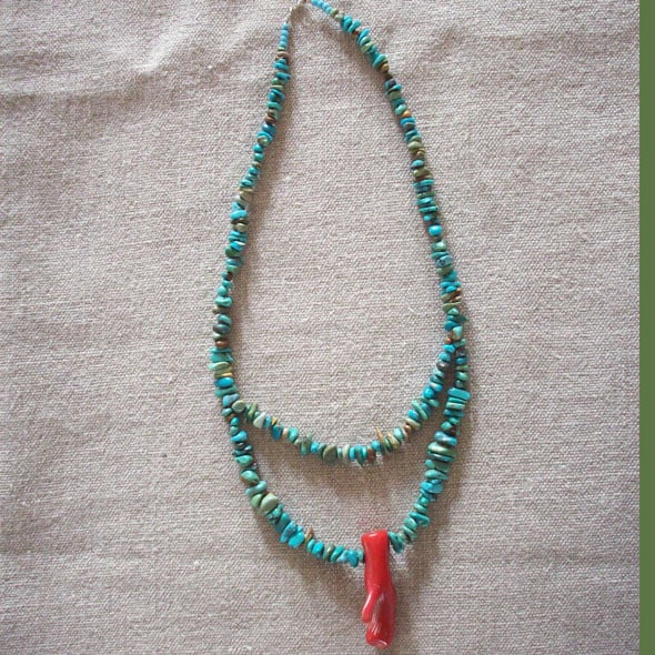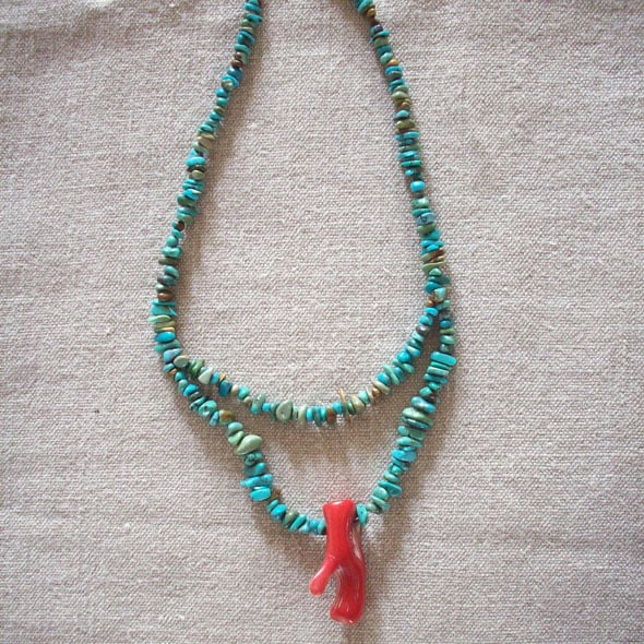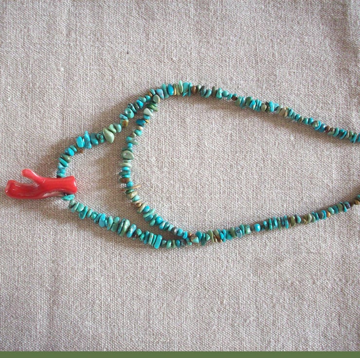 A lovely big piece of branch coral sits on a cradle of turquoise beads with a half strand of the turquoise beads above it. This is a vibrant colour combination loved from the Native American tribes to the Tibetan and Nepalese jewellers in the Himalayas. Fastened with a sterling silver bolt ring and loop. Comes to you in a gift bag. I use Special Delivery as it gives insurance cover to both buyer and seller. Please contact me for non-UK and multiple items as prices vary. Thanks for looking and for supporting hand-made!