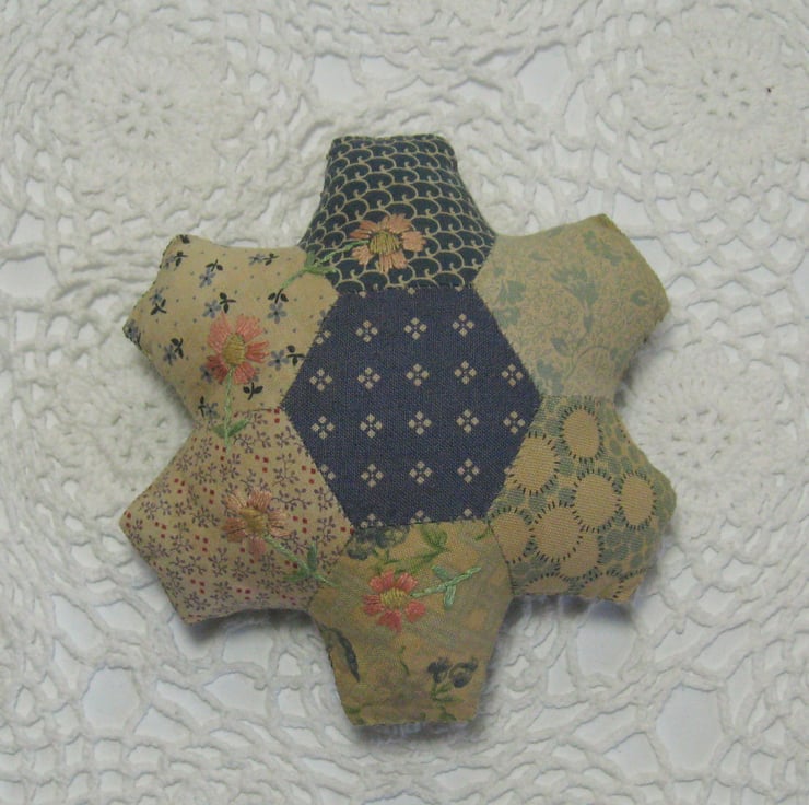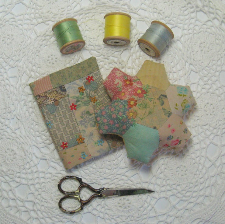 The pin cushions are completely hand sewn using traditional English paper piecing. After the patchwork has been sewn the fabric is then carefully tea dyed to create a softened and aged patina.....then a piece of quilt wadding is sewn on the back of either side to add a little strength to the top fabric (and also stops the pin cushions looking lumpy and bumpy). They are filled with tiny fabric scraps so are nice and firm.