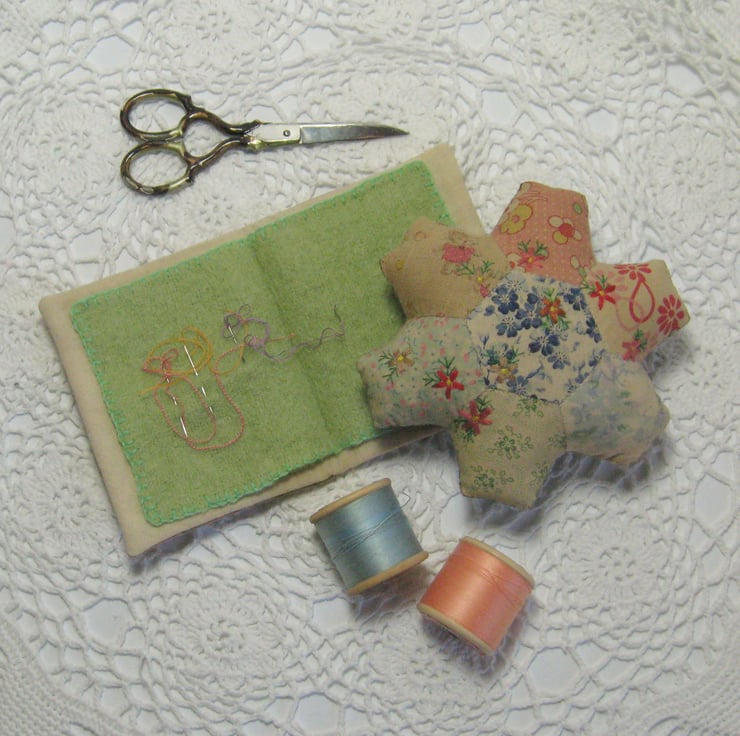 These needle case and plump pin cushions try to capture a little bit of the spirit of yesterday when sewing cottons had gorgeous names, who wouldn't have wanted to have bought "gay kingfisher" or "frivolous pink".