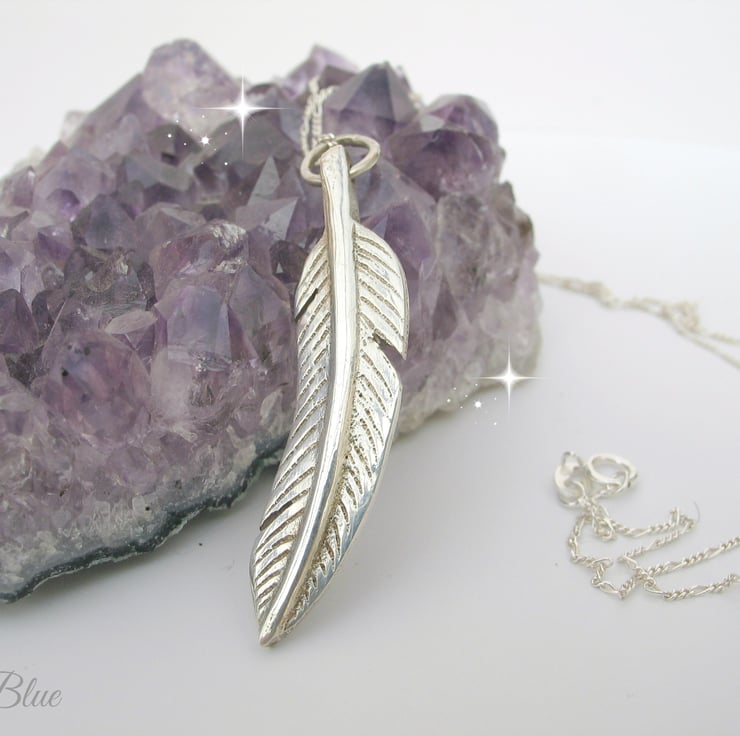 The feather has been hand carved in wax and then hand cast in sterling silver before hand polishing. It really is a beautiful necklace. Each one will be slightly different as they are hand made to order, a truly unique piece of jewelry.