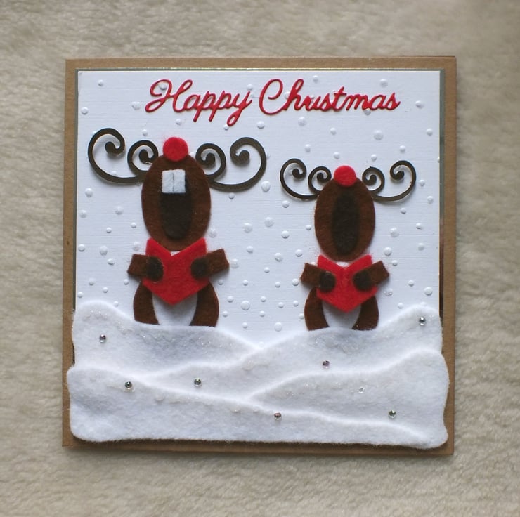 This makes a charming Christmas card, two reindeers singing away to their hearts content! The base is made using kraft card for an organic feel, and layered with a square of snow falling glittered and embossed white card stock, matted with silver mirri. The reindeers and layers of snow are die-cut from felt. Includes, ‘Merry Christmas’ sentiment inside. Size approx. 6”x6”.