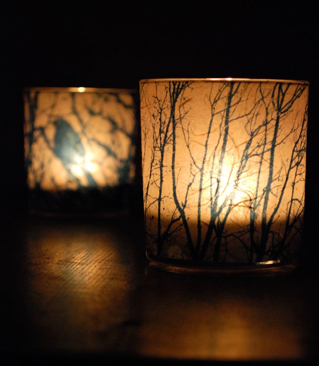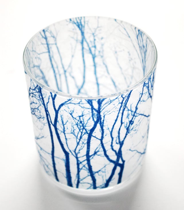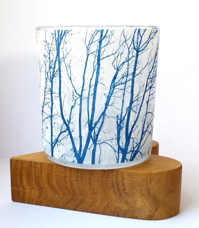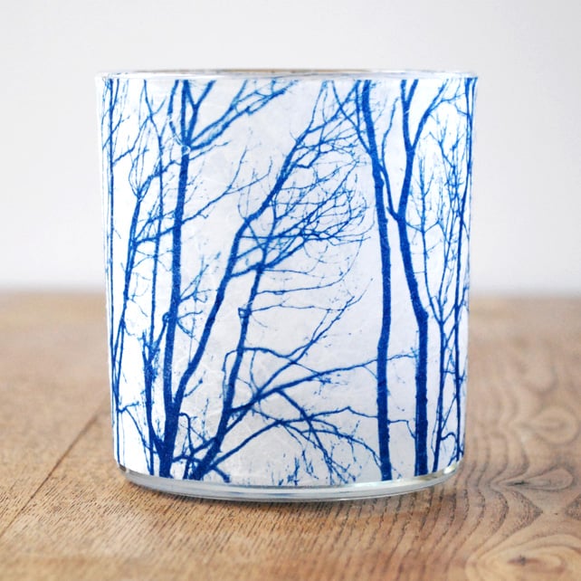 This unique candle holder is created using the old photographic process of Cyanotype. A light sensitive solution is applied to paper, a large format negative laid on then exposed to sunlight, the solution is then rinsed off and the paper dried, fixing the image. To make these candle holders the paper is then applied to glass. The thinness of the paper allows the light to shine through the image.