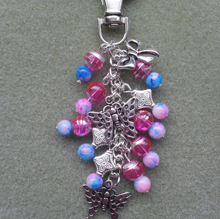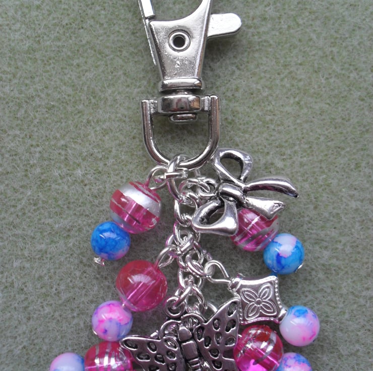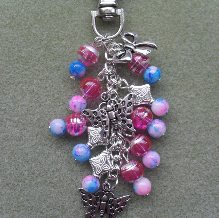 Bow and 2 butterfly charms with a selection blue and pink glass beads with silver spacer beads are attached to a silver plated chain and clasp