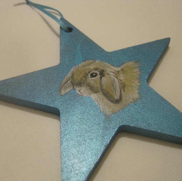 This is an MDF star which has a hand painted portrait of a lop eared rabbit on it. The background is a dull metallic blue, and it comes with matching blue ribbon for hanging.