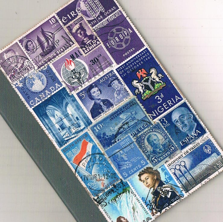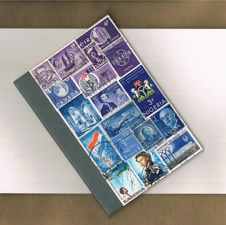 As well as a single Cuban stamp, the OOAK cover collage of this notebook also includes postage stamps from: Australia, Canada, Denmark, France, Hong Kong, Ireland, Malaysia, Nigeria, Singapore & Malaya, South Africa, Spain, the United States, and Zambia.