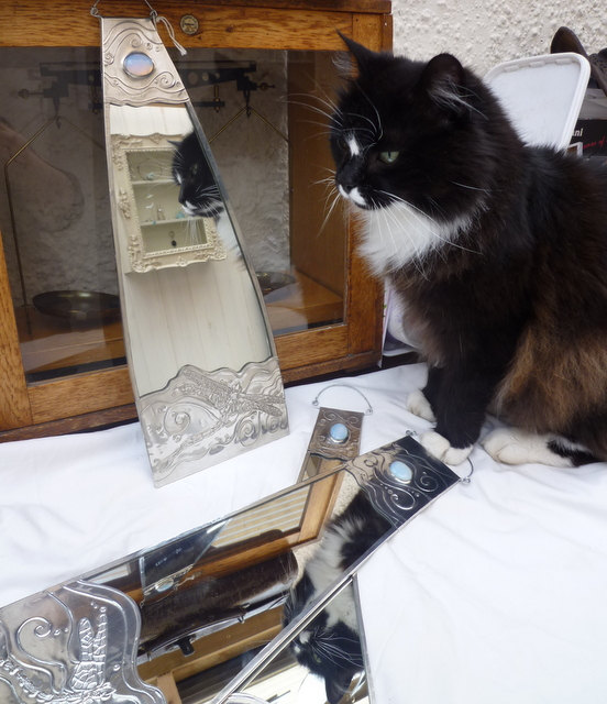 Dragonfly mirror. Graceful Art Nouveau style hanging mirror. Wall mirror adorned with a beautiful pewter dragonfly. I have included images of 3 different pewter dragonfly mirrors each of which has a lovely sea opal stone set in to the pewter at the top.