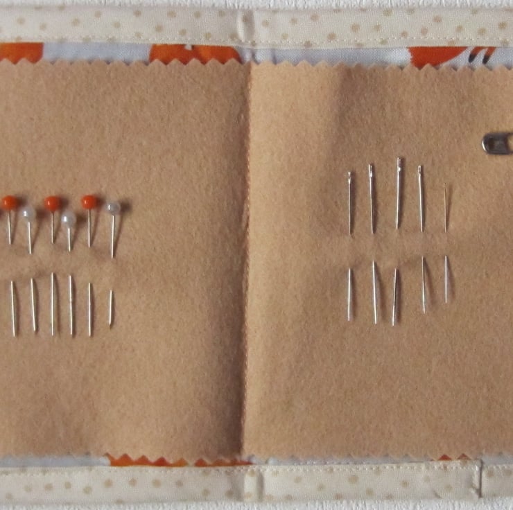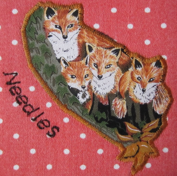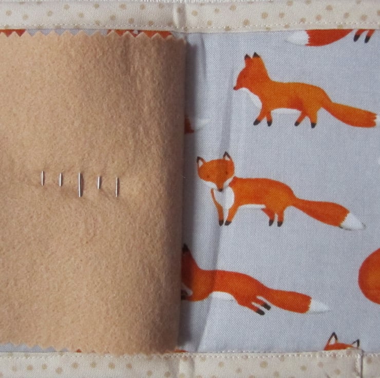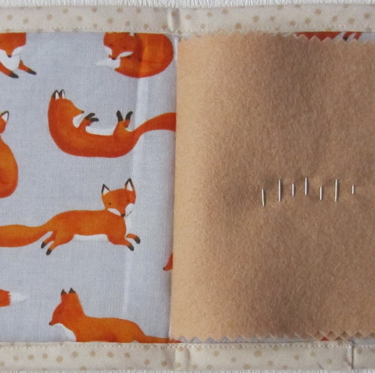 Lightly padded orange and cream spotty needle case with appliqued foxes. Edged in cream spot bias binding and backed with a cute fox and rabbit fabric. Inside there is a felt page complete with needles, pins and threader.