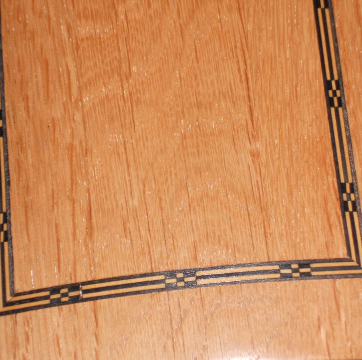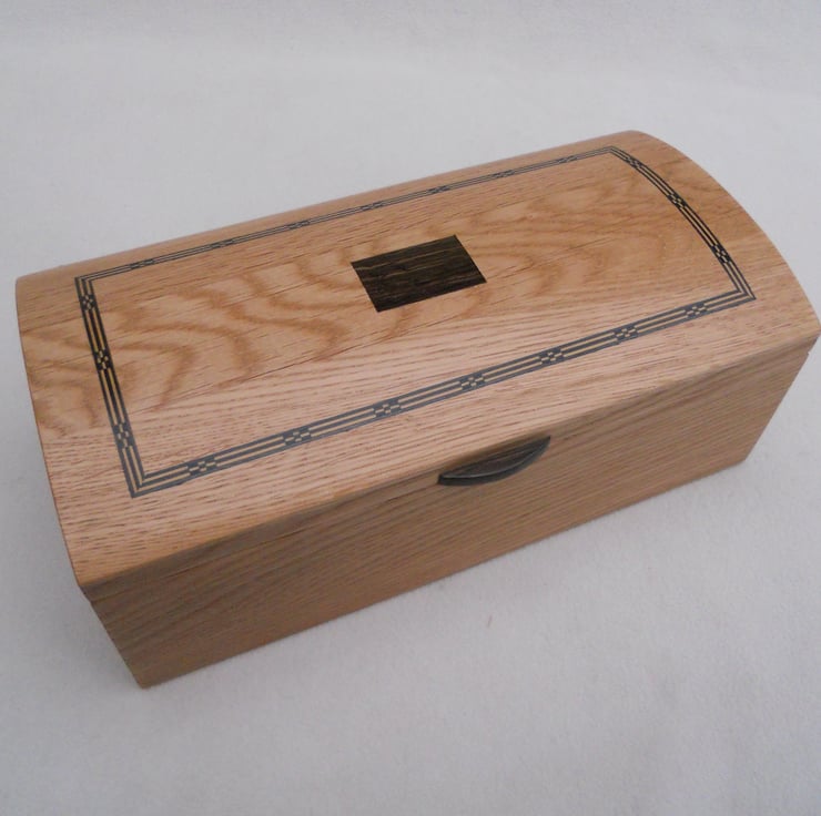An inlaid bow top Jewellery Casket in solid oak with a centrepiece and lift-up of bog oak reputedly 5,000 yrs old.
