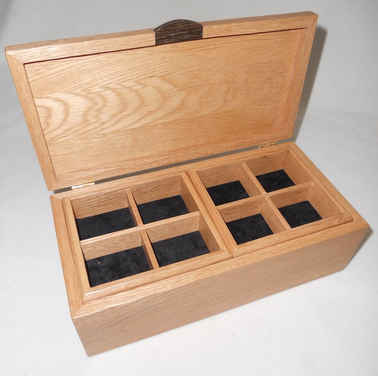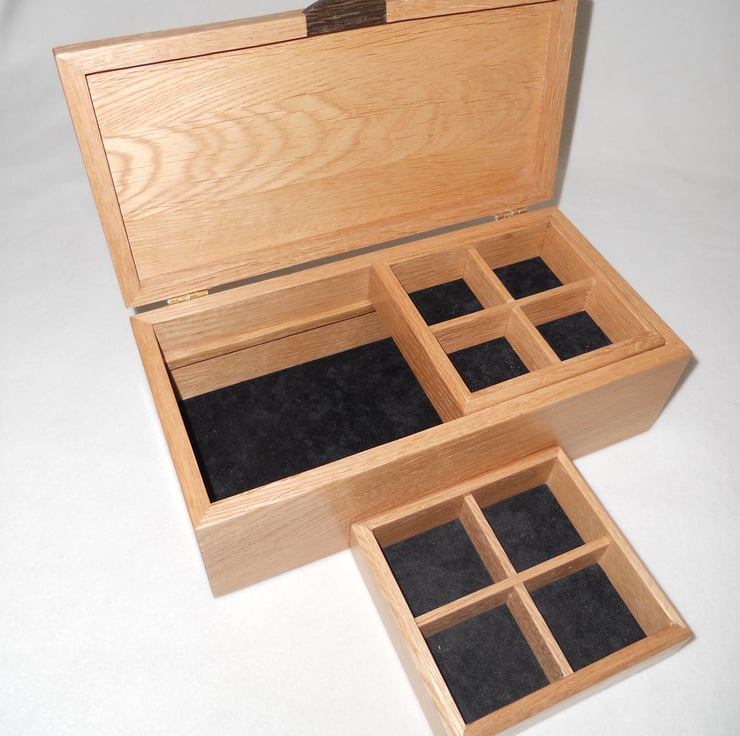 There are 2 lift-out partitioned trays and together with the bottom of the box are lined with black suede/like material .