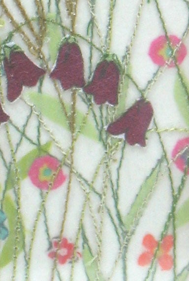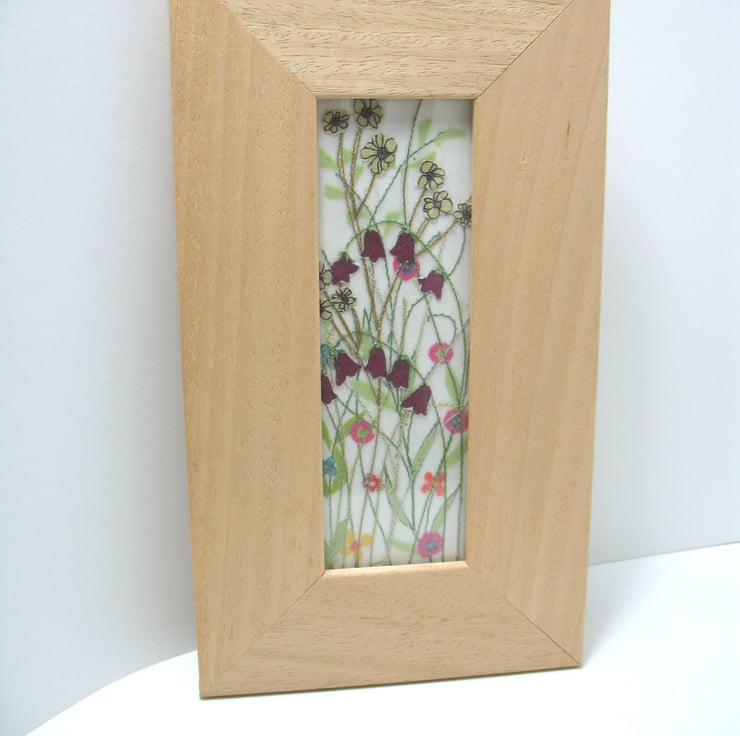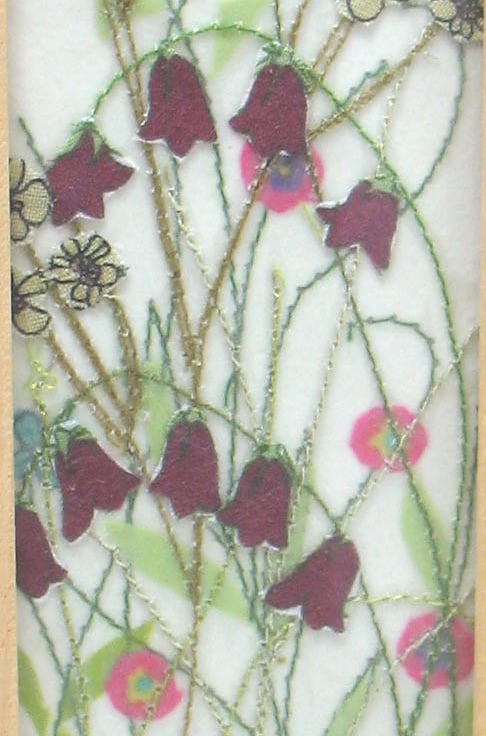 The meadow is layered and stitched from recycled fabrics and papers and incorporates hand cut and stitched flowers.