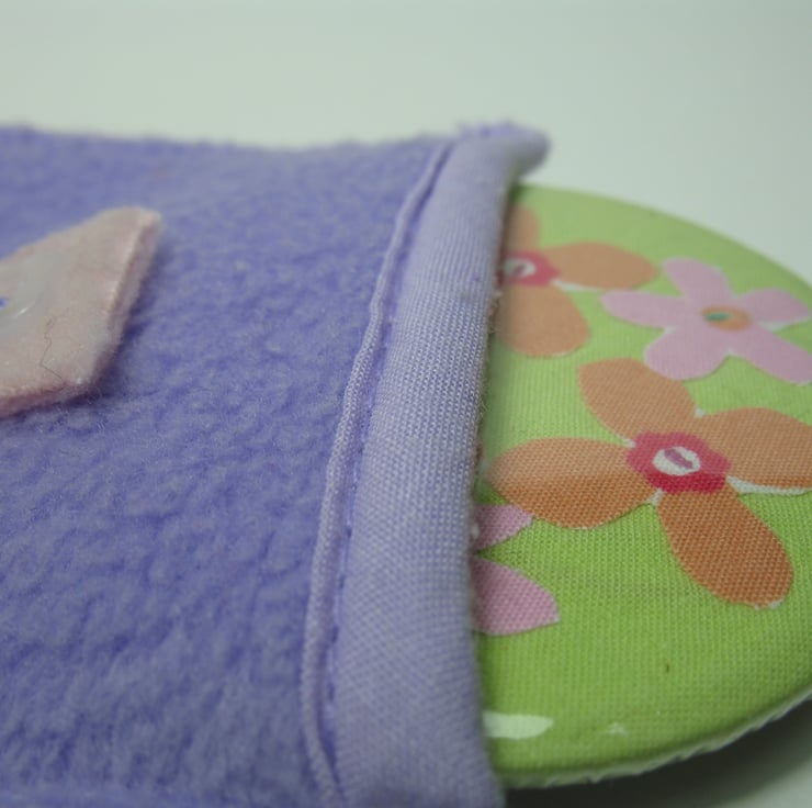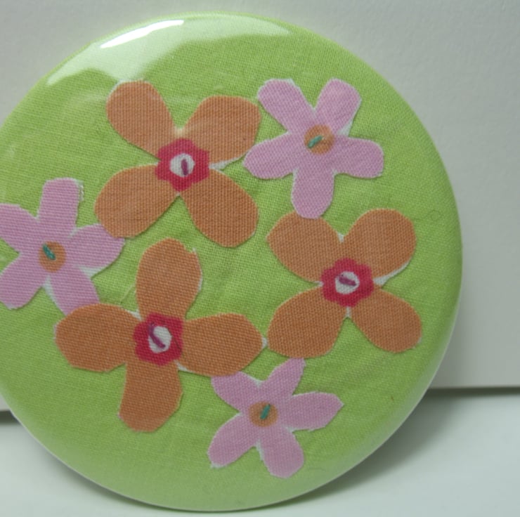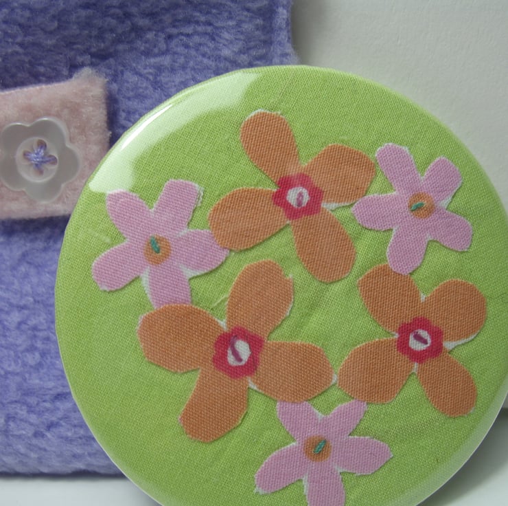 The design is individually cut and sewn by hand (It is not a printed design!) before being pressed onto a metal rimmed mirror. The fabric flower design is protected with a plastic backing so it is wipe clean.