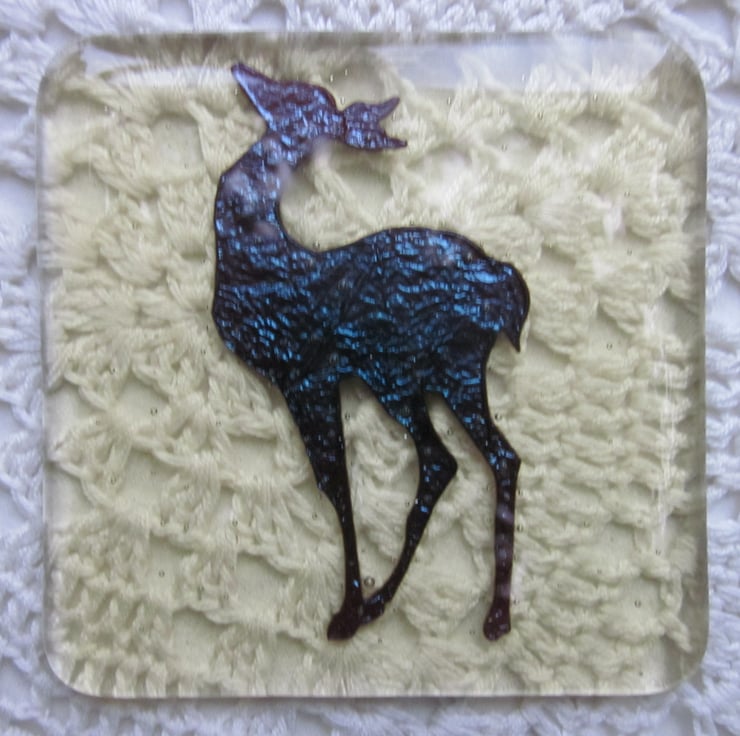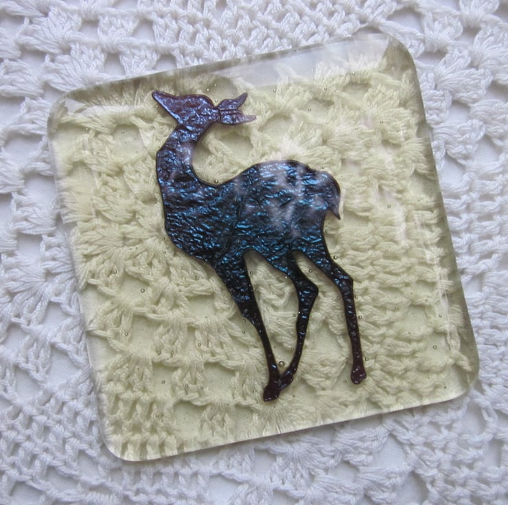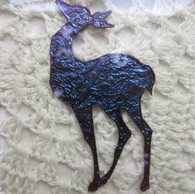 This coaster has a copper deer within pale amber tinted glass. It has been fully annealed to make it strong and is suitable for use with hot tea or coffee cups but not pans straight from the oven. This would make a great gift or stocking filler.