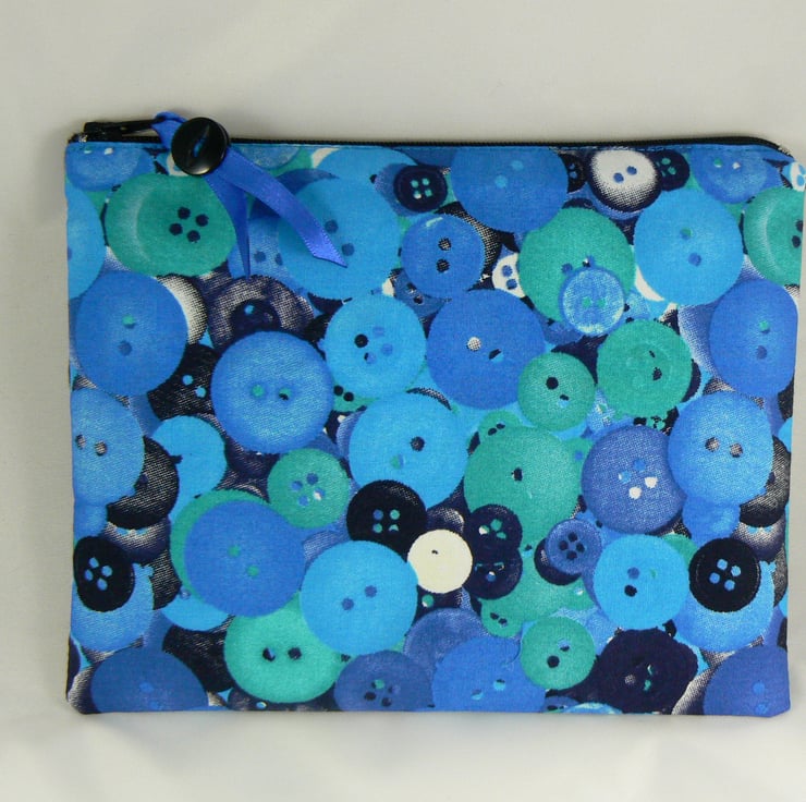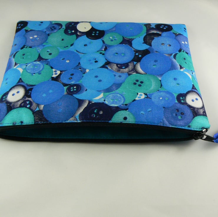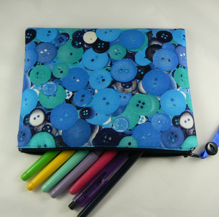 I have made this pencil case in a bright turquoise blue and jade green button print fabric ( interfaced) and used jade green cotton for the lining. I have attached a blue ribbon and two black buttons to the zip pull. The case measures 19 x 15 cm.