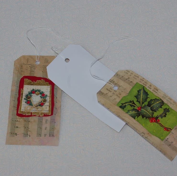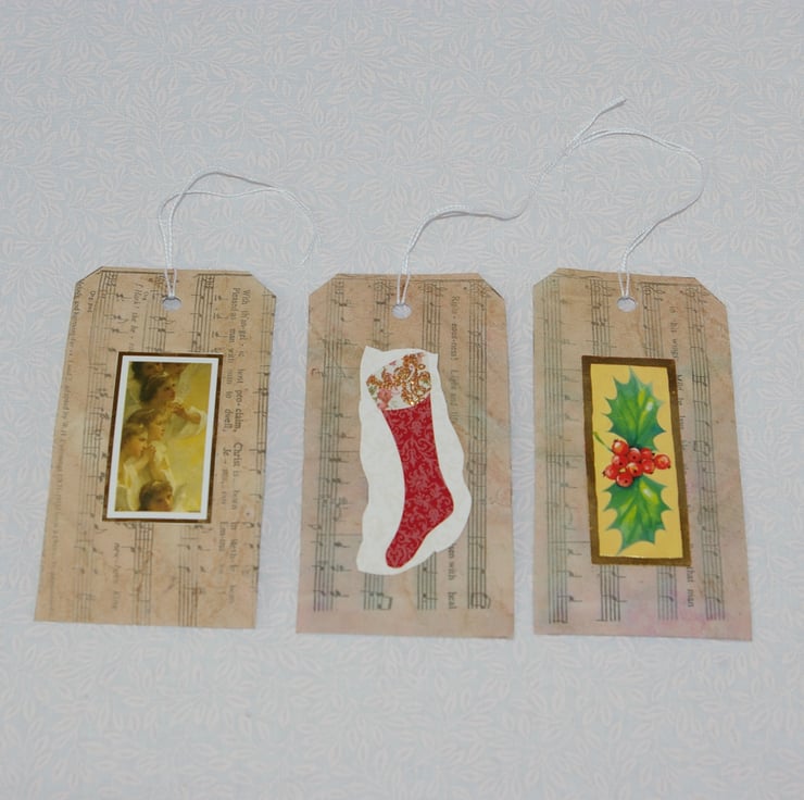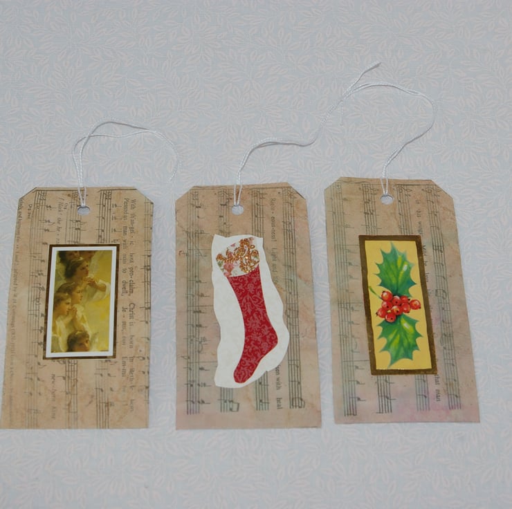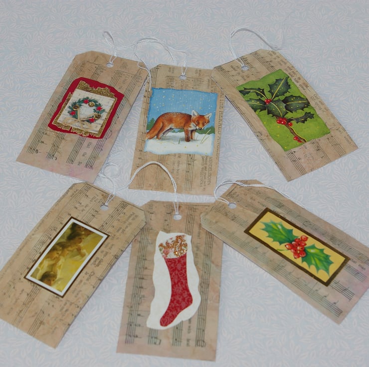 A retro styled, set of six large handmade Luggage type Christmas Gift Tags. These Gift tags have been made from goody quality white card stock and an old sheet of Carol music which has fallen out of an old damaged hymn book. As the page has been well loved in the past it has become worn, yellowed with age and now carries many other tiny imperfections such as splits, faded printing and marks. All of which add to the beauty of these upcycled tags.