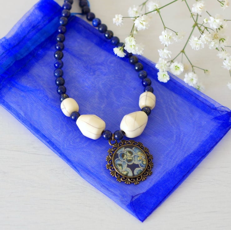 Navy Blue Pendant Necklace with Flowers Art Print and Lapis Lazuli Gemstones
