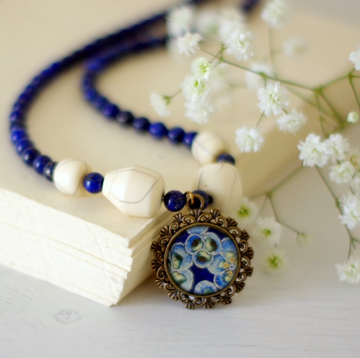 This is a resin pendant necklace created using a mini print of my original painting titled "Petals in Moonlight" and a beaded necklace to complement the colour and the style of the pendant. The flowers art print is fixed onto the bronze bezel with ice resin. For the necklace, I used lapis lazuli and white gemstones. The necklace looks very elegant with a hint of vintage due to the colour combination and the bronze pendant tray. The size of the necklace is approx 18" and the pendant is 1".
