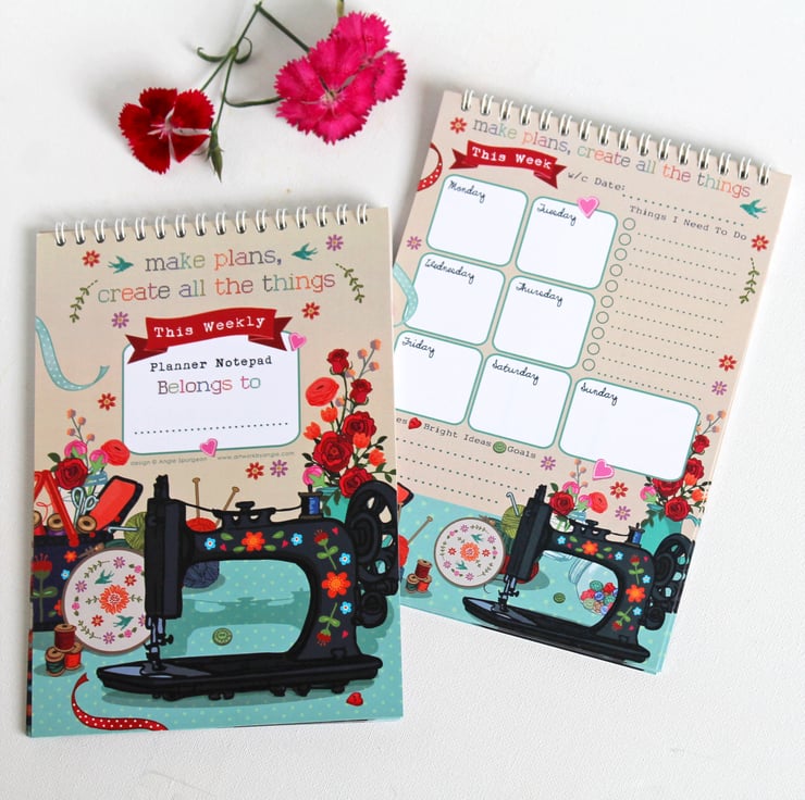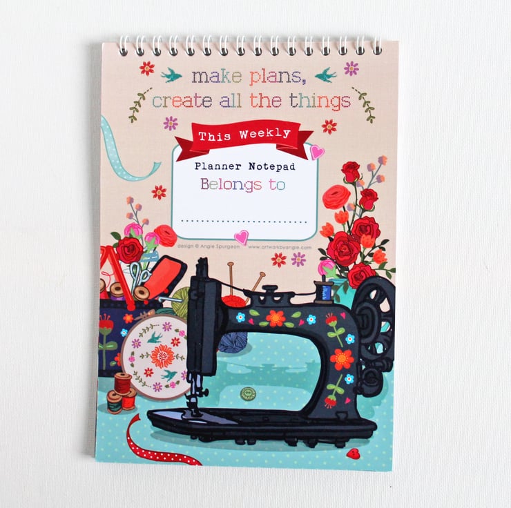 A5 (148x210mm) spiral bound 30 page notepad with weekly planner / journal pages inside. Each page is printed double sided.