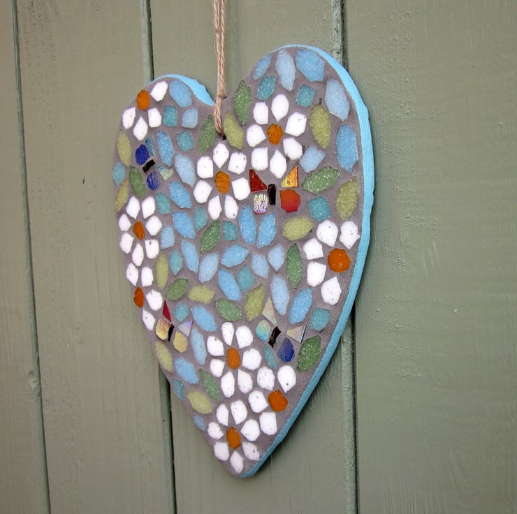 A mosaic hanging heart garden decoration with iridescent blue and red butterflies with metallic shine to their wings, white daisies flowers with their bright orange centres, pastel green leaves, and sky blue background make this heart a piece of summer to have all year round. The edges of the heart have been hand painted with a sky blue weatherproof paint to add to the light and airy look. Great to use in the garden or the home.