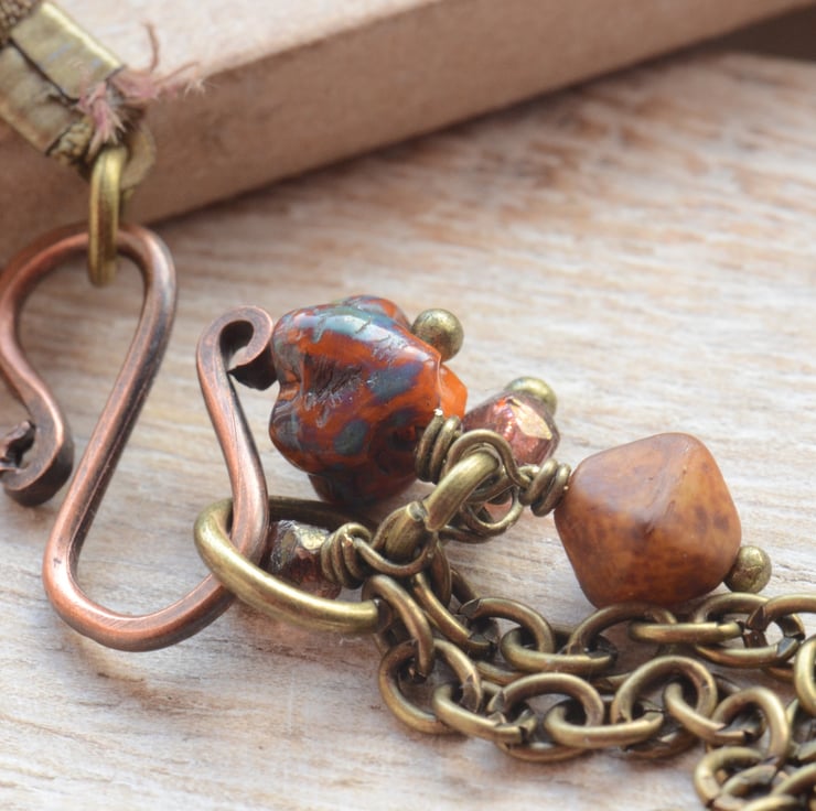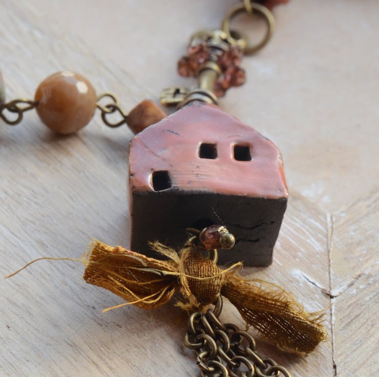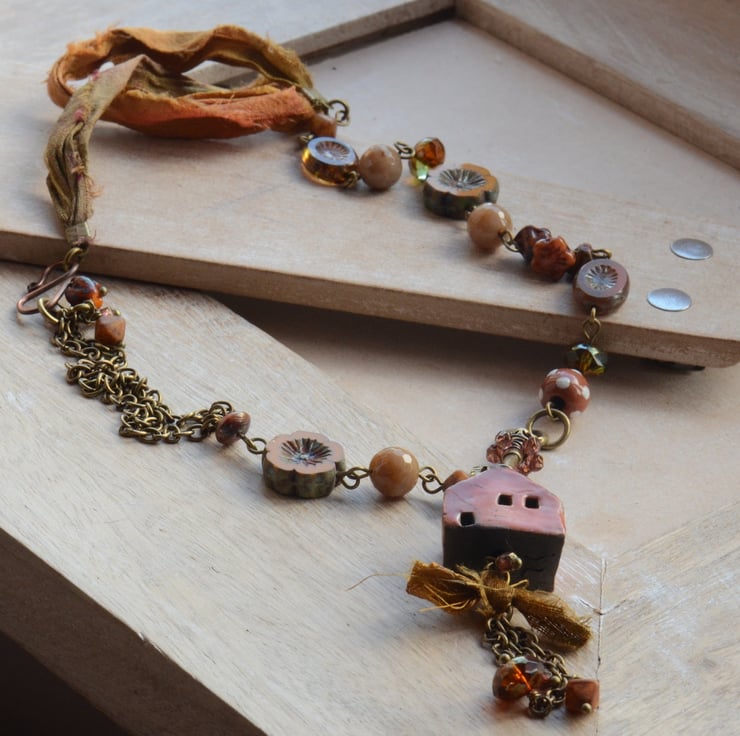 A lovely warm orange colour Raku Ceramic handmade house is the focal for this necklace. I have teamed the house bead with an antique bronze plated key which I have wire wrapped with little Czech table cut gold beads, a Ceramic polka dot bead and a mix of Czech glass beads including Picasso finish blossoms and ovals and faceted beads and little flower cups. The necklace has sari silk ribbon in shades of warm mustard orange, a handmade copper "s" clasp with two little strands of antique bronze plated chain to finish. There is also a drop front with a bow of sari silk ribbon and little drops of Czech beads.