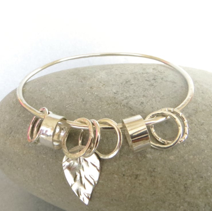 Silver Bangle with Leaf Charm and Spinner Rings, Gift for nature lover