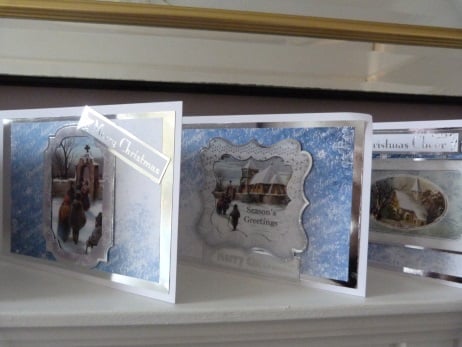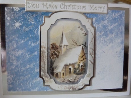 A pack of 4 Christmas cards consisting of different views of village churches, These are highlit by raised co-ordinated frames. Mounted onto festive blue paper, then onto silver mirri card and then onto pristine white quality card.