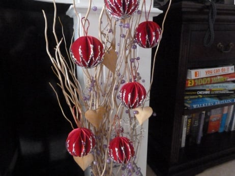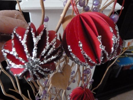 A set of 6 baubles completely hand made from quality red card. Folded into a honeycomb shape. Finished off with silver glitter and red cord for hanging.