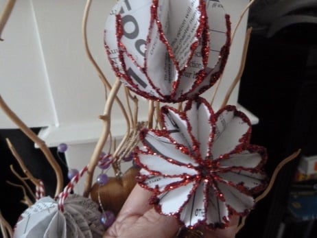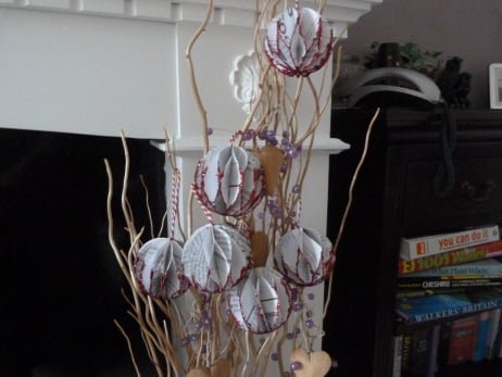 A set of 6 baubles completely handmade from quality book paper - to give that modern quirky look - folded into a honeycomb pattern and finished off with bright red glitter. Red and white butchers twine for hanging.