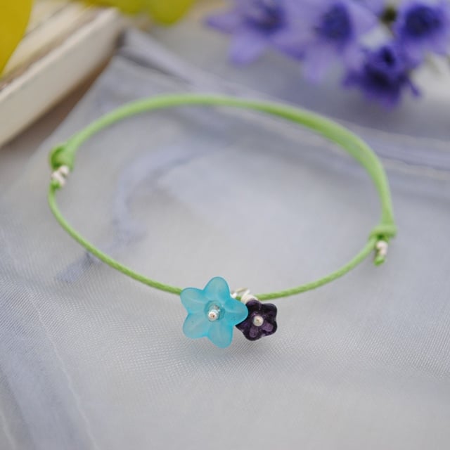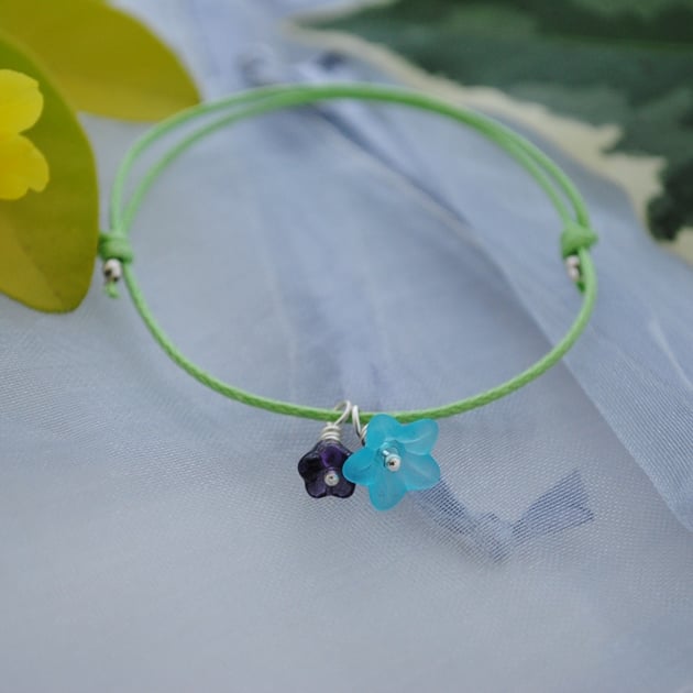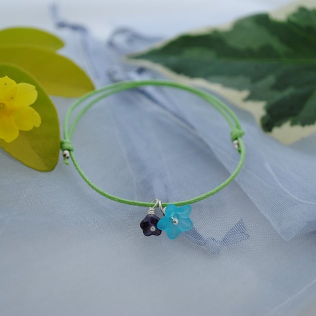 A simple friendship bracelets made with waxed apple green cord with a turquoise & purple flower charm.