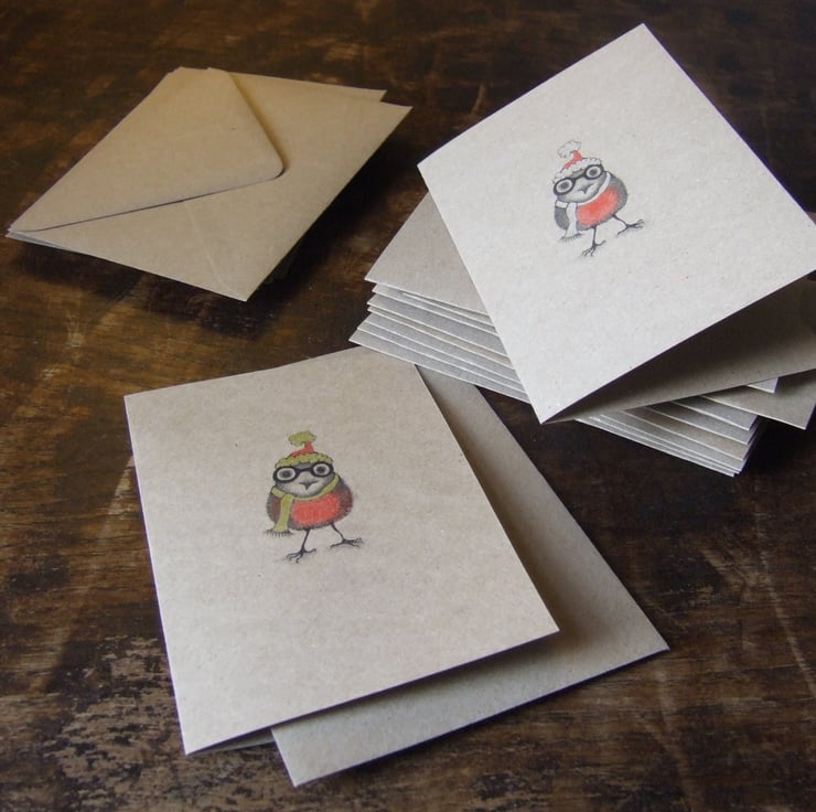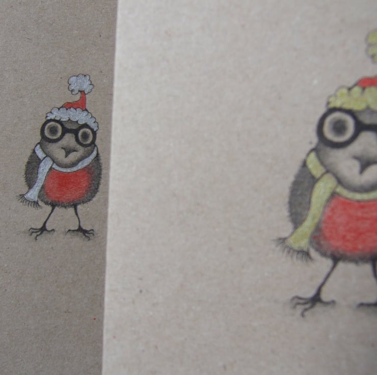 Original artwork printed to 210g recycled card and lovingly individually coloured with pencil crayon and metallic pen. Five little robins wearing silver hats and scarves, five little robins wearing gold hats and scarves.