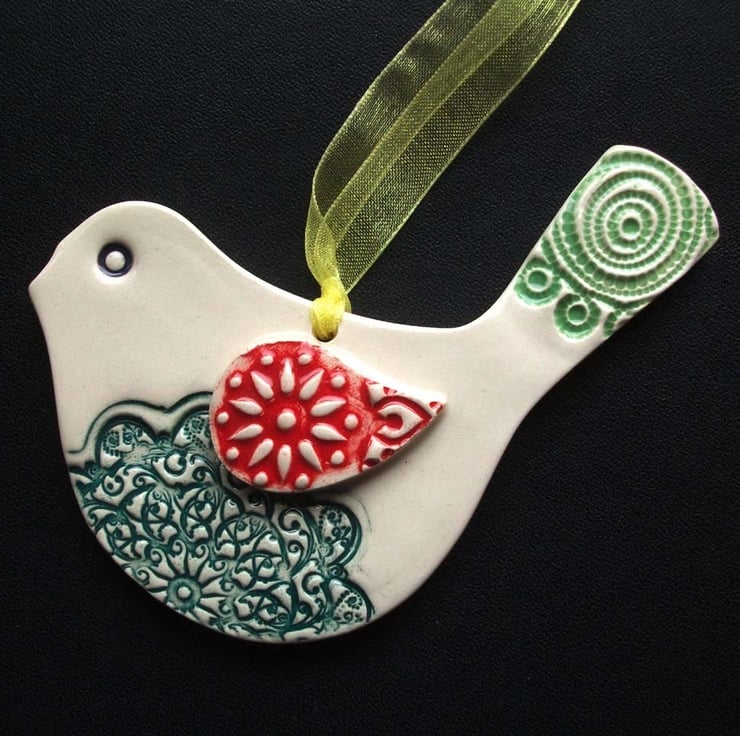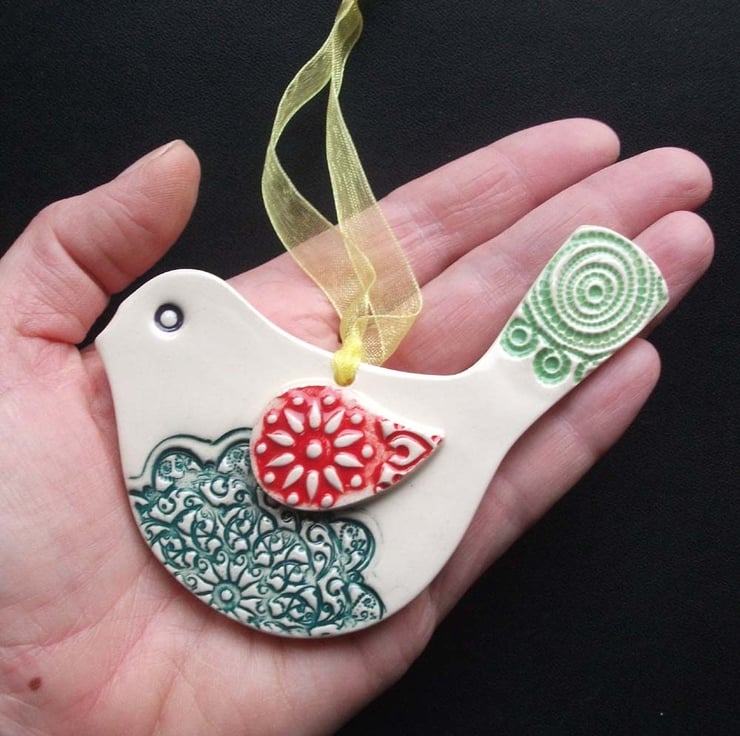 This cute little bird is made from white earthenware clay and decorated with bright, bold pattern.